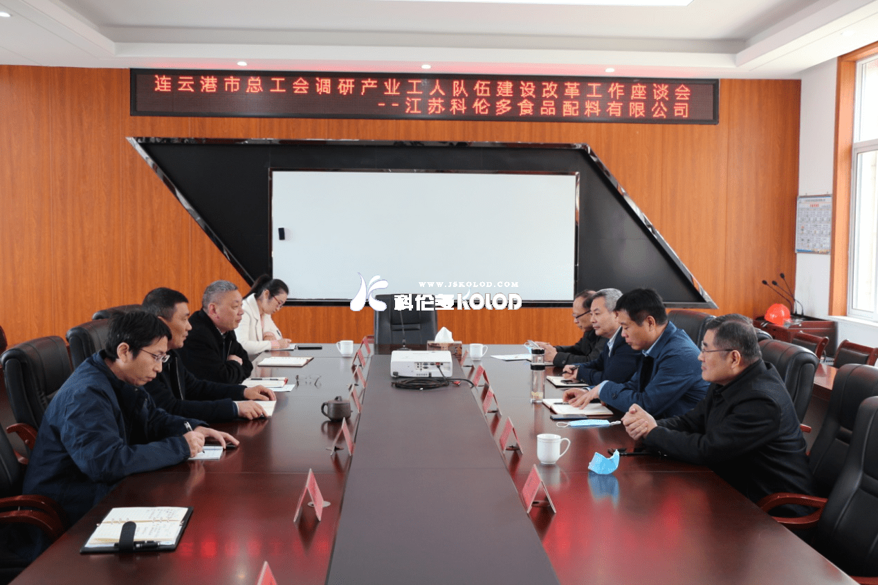 2020年4月14日,連云港市總工會(huì )黨組書(shū)記、副主席丁維杰帶領(lǐng)市總工會(huì )相關(guān)領(lǐng)導一行8人,蒞臨江蘇科倫多食品配料有限公司,調研產(chǎn)業(yè)工人隊伍建設改革工作座談會(huì ),灌云縣總工會(huì )主席徐順達陪同調研。首先由科倫多董事長(cháng)封寬裕進(jìn)行匯報,通過(guò)公司人才隊伍建設、人員福利待遇、員工保障、公司長(cháng)期規范建設等多個(gè)方面進(jìn)行了匯報,隨后丁書(shū)記表示,科倫多公司在工人隊伍建設這塊是走在全市民營(yíng)企業(yè)前列的,保障了員工利益,同時(shí)也貢獻了社會(huì ),公司制度完善,政治站位極高,希望公司有序推進(jìn),取得更高的進(jìn)展。